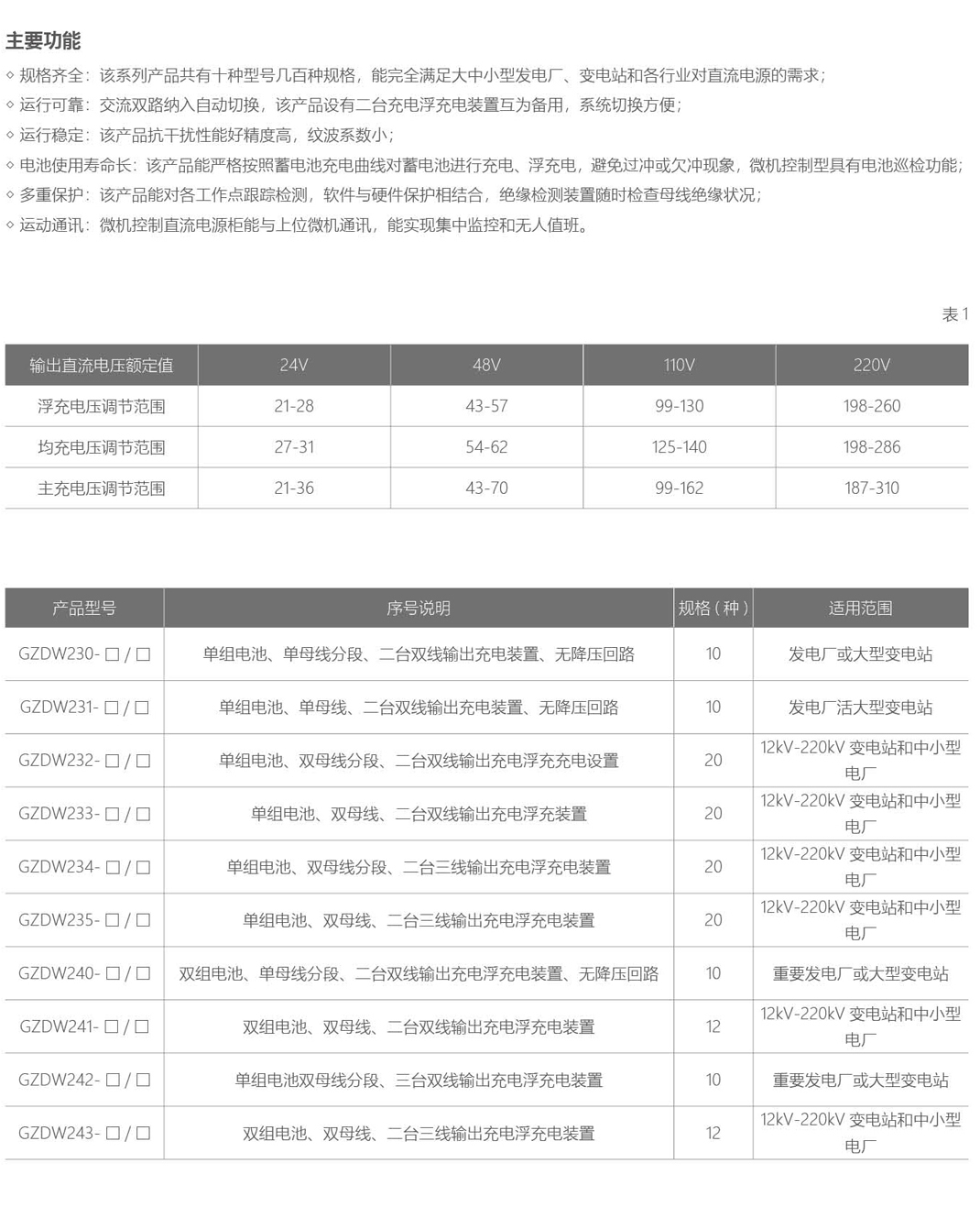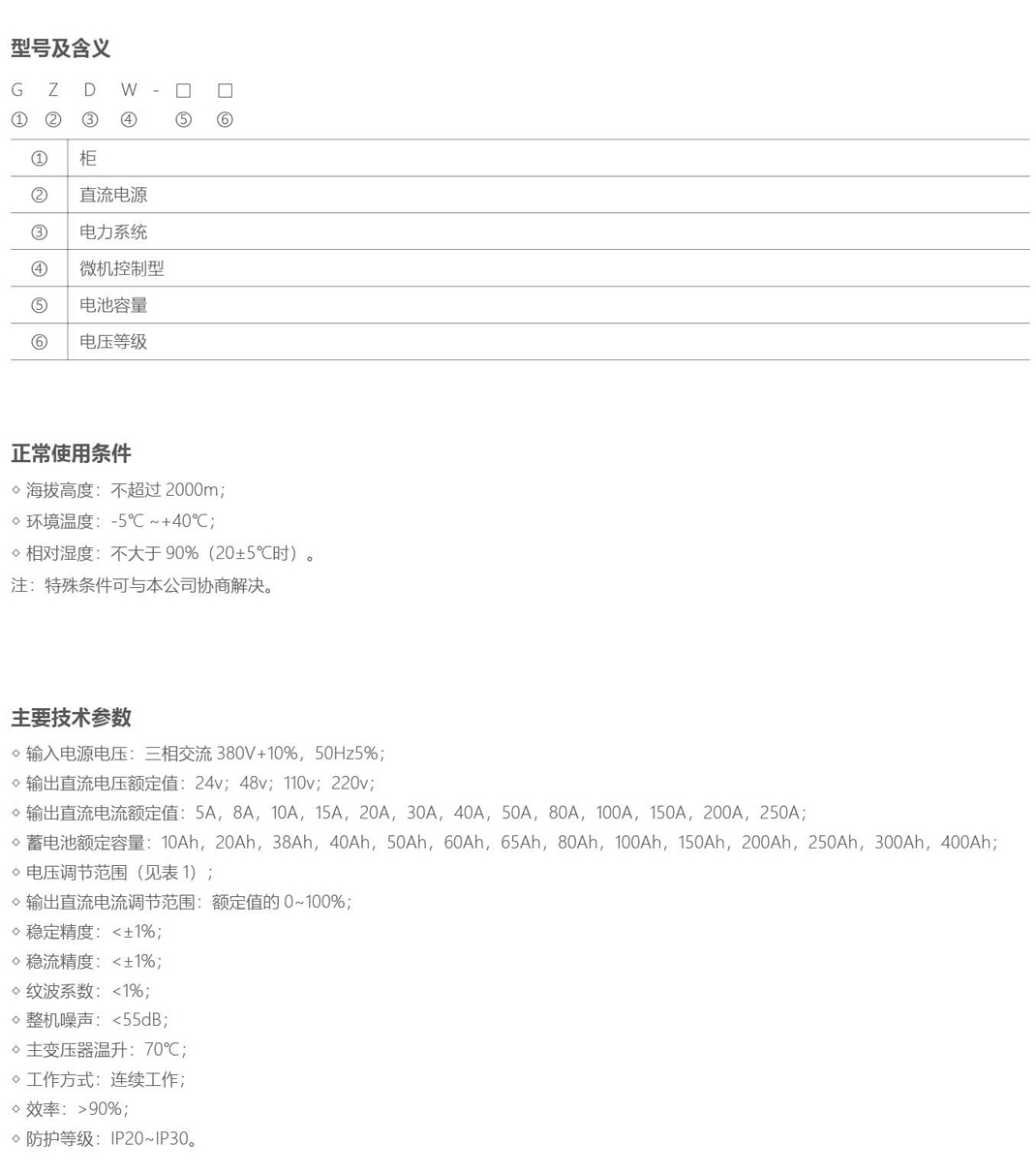 GZDW直流电源柜应用于大中小型发电厂和变电站,作为正常运行和事故状态下的高压开关分合闸、继电保护、自动控制、事故照明、灯光和音响信号等所需的直流电源也可应用于冶金、铁道、矿山、石化、邮电、通讯、医疗卫生,银行、宾馆、高层建筑和计算机网络等行业所需的直流电源;微机控制直流电源柜可用于无人职守、远程集中监控的发电厂、变电站和其他行业的直流电源。
