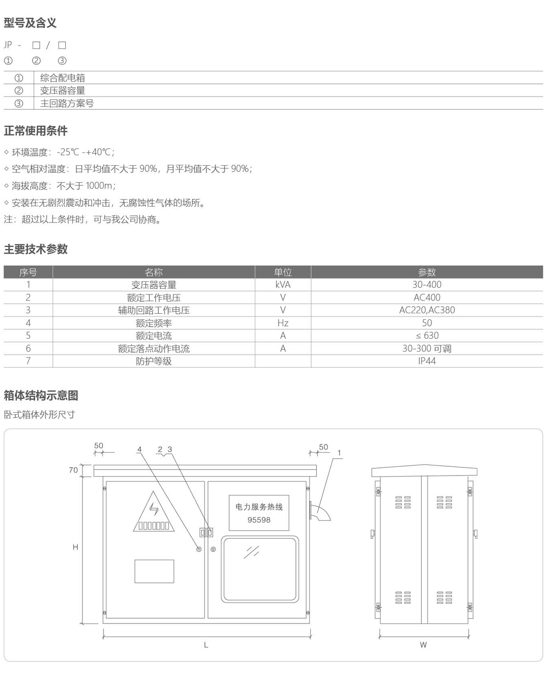 JP户外综合配电箱是集计量、出线、无功补偿等多功能于一体的,户外综合配电装置;集短路、过载、过电压、漏电等保护功能 ;体积小、外型美观、经济实用,安装于户补柱上变压器的电杆上,是城乡电网改造的可靠配电产品。
