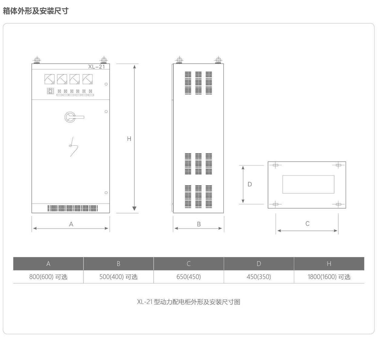 XL-21 型动力箱广泛用于发电厂及工矿企业中,在三相交流 500V 以下三相三线、三相四线、三相五线等配电系统中作动力或照明配电之用,系户内靠墙安装,屏前操作,屏前检修;箱体为全封闭结构,由 C 型材或 8MF 型材拼装而成。箱内采用新型旋转式负荷隔离开关,可带负荷操作,正面门上装有电压、电流指示仪表以及信号灯、按钮、转换开关等主令元件。本配电箱内采用自行设计的新型组件,结构紧凑,造型美观大方,维护方便,多种接线方案可供用户选择。