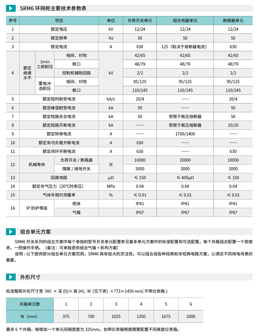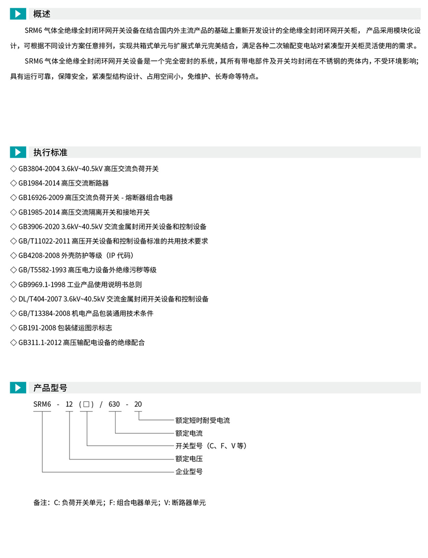 SRM口-12全绝缘充气式环网柜系三相交流额定电压10kV, 额定功率50/60Hz的户内箱式交流金属封闭开关设备,适用于工厂、车间、住宅高层建筑等场所的配电系统、环网供电或双电流辐射供电系统,起接受、分配和保护作用,也适用于箱式变电站中。
